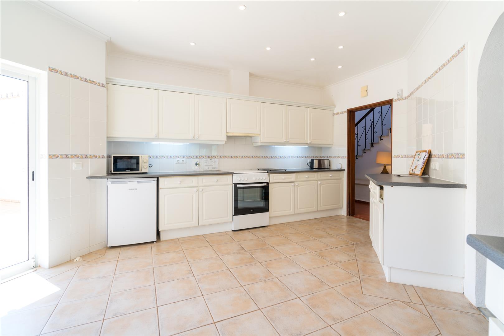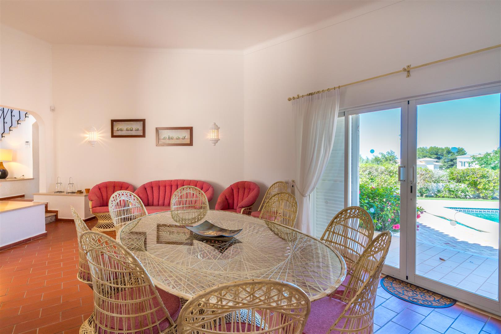 This light and airy room also offers a seating area with sliding glass doors to the pool terrace. There is an electric heater, and two steps leading up to the kitchen.