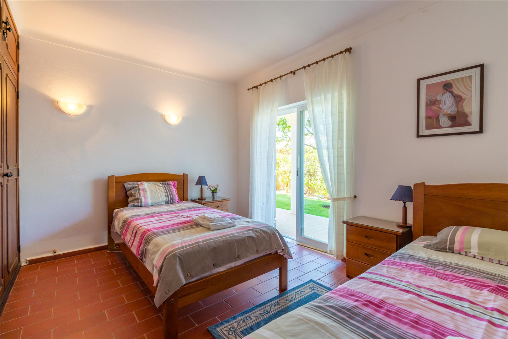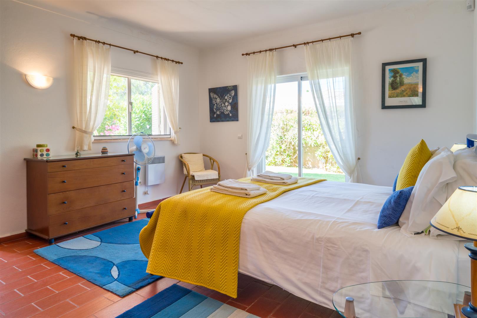 Bedroom with fitted wardrobes, electric heater, and sliding glass doors to the garden and swimming pool. Ensuite shower room.