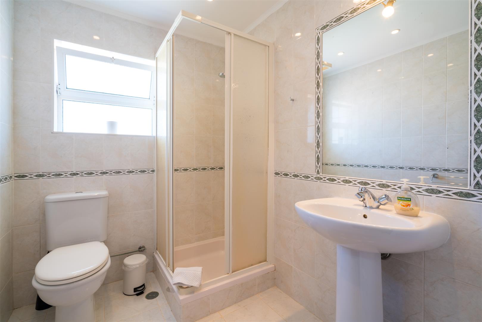 En suite bathroom with shower, WC, frosted window, heated towel and bidet and basin.