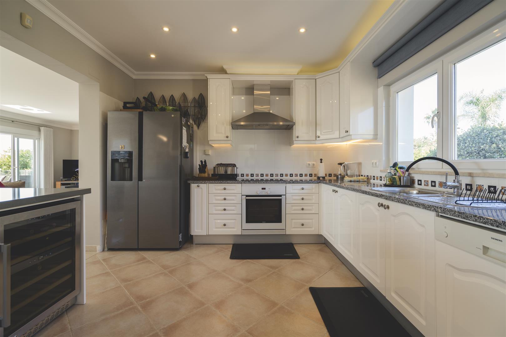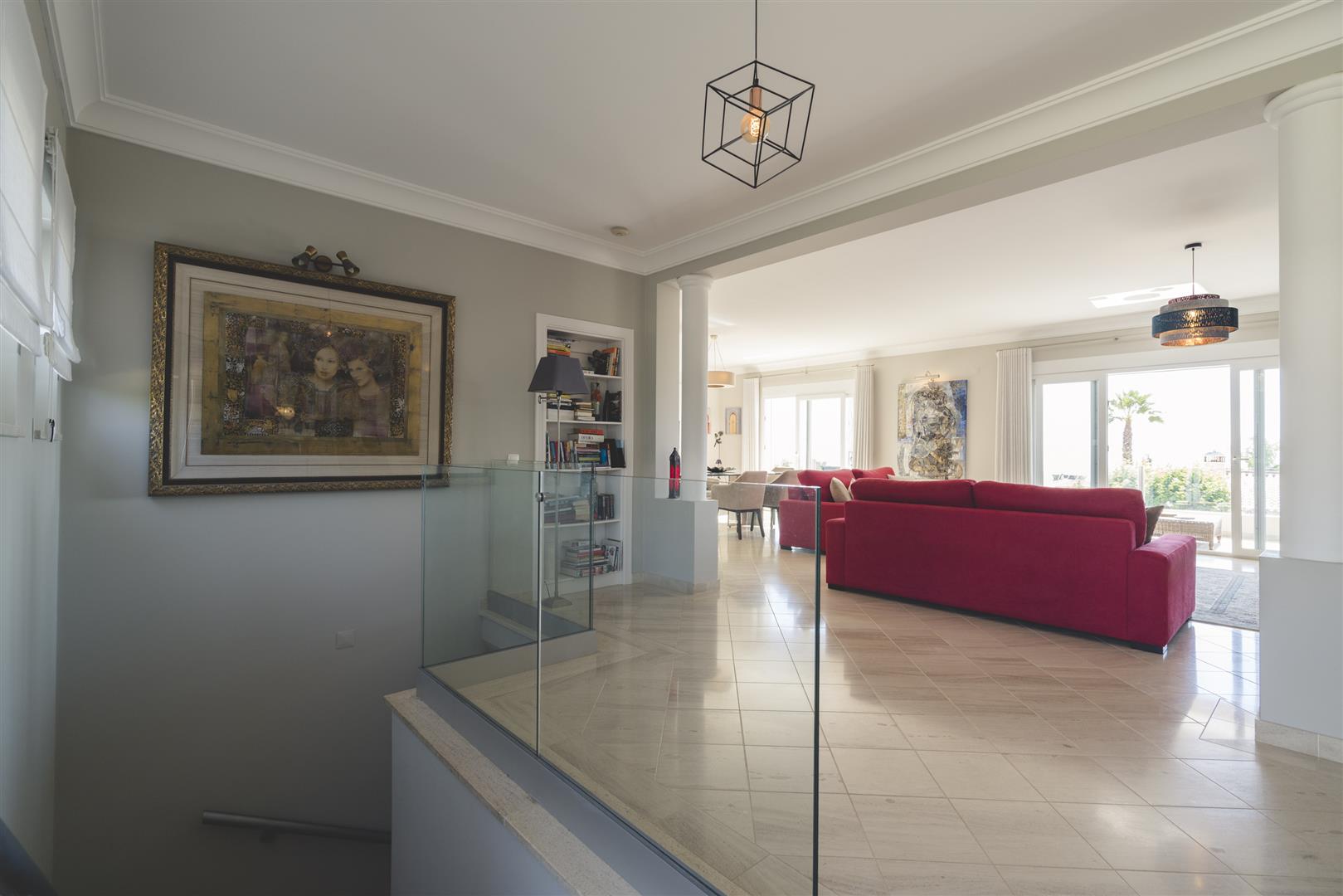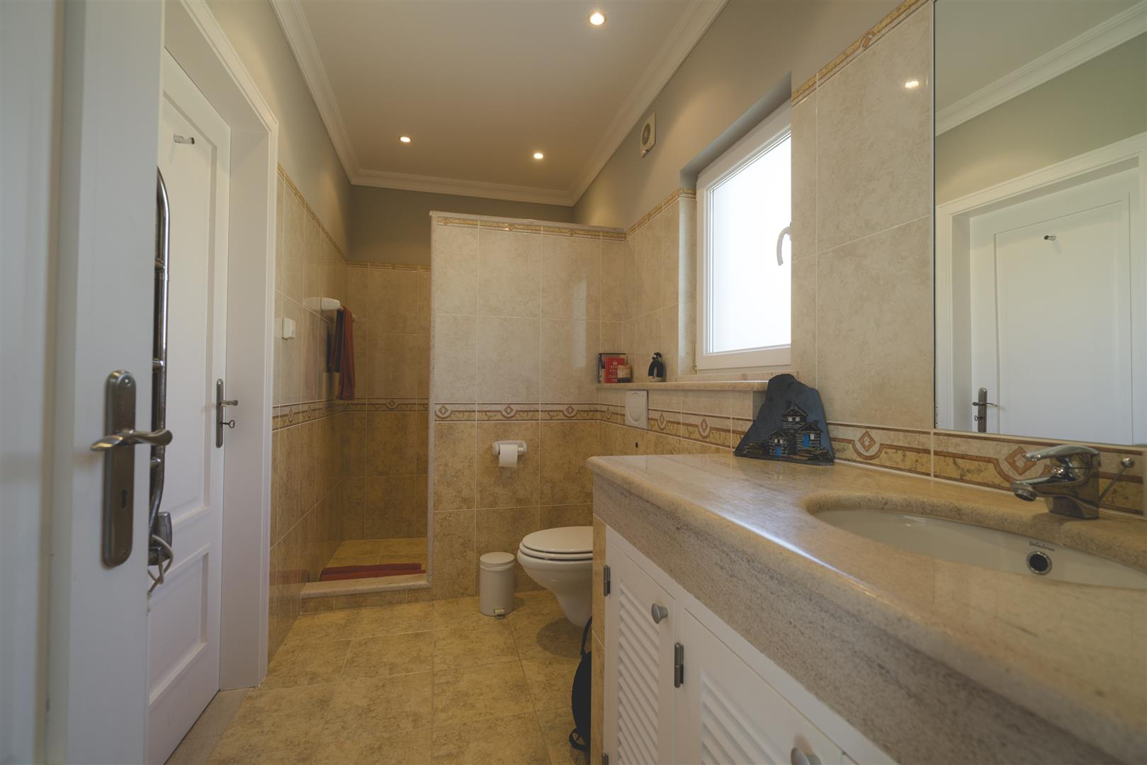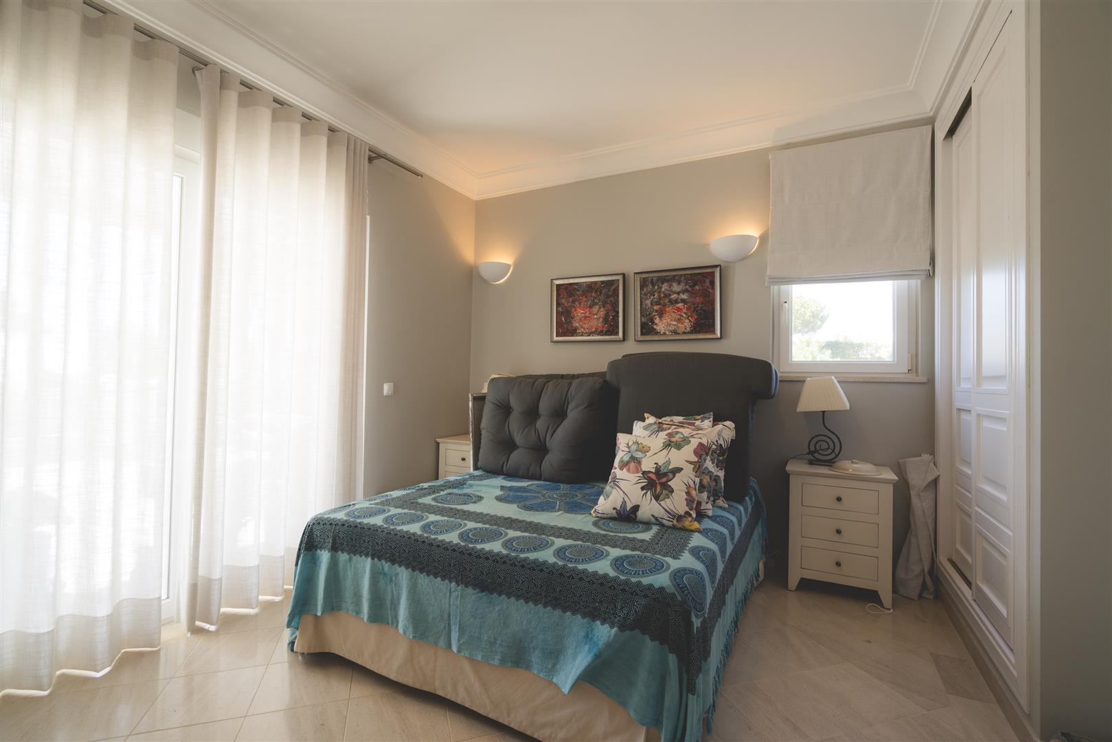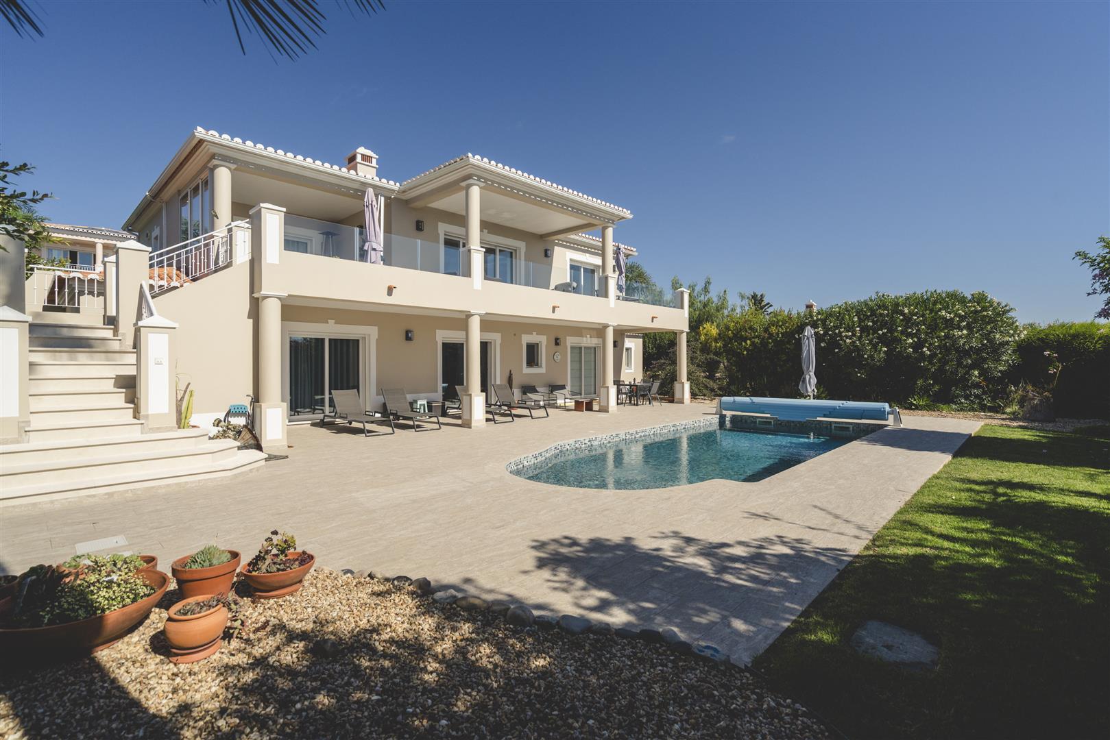 Outside, the property is accessed via electric entrance gates to a traditional calçada stone driveway, leading to a covered carport and additional parking. The mature garden, surrounded by trees and shrubs, ensures a private, tranquil setting. In the heart of the garden, a swimming pool and its terrace become a natural extension of the home’s living space — perfect for relaxing or entertaining.