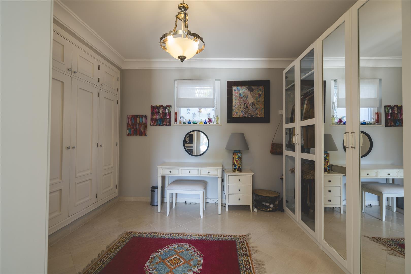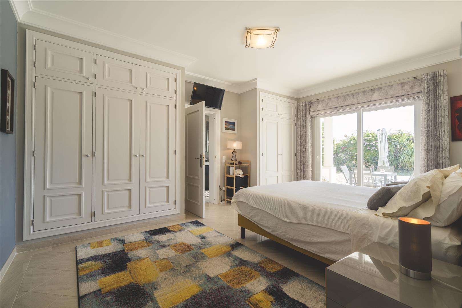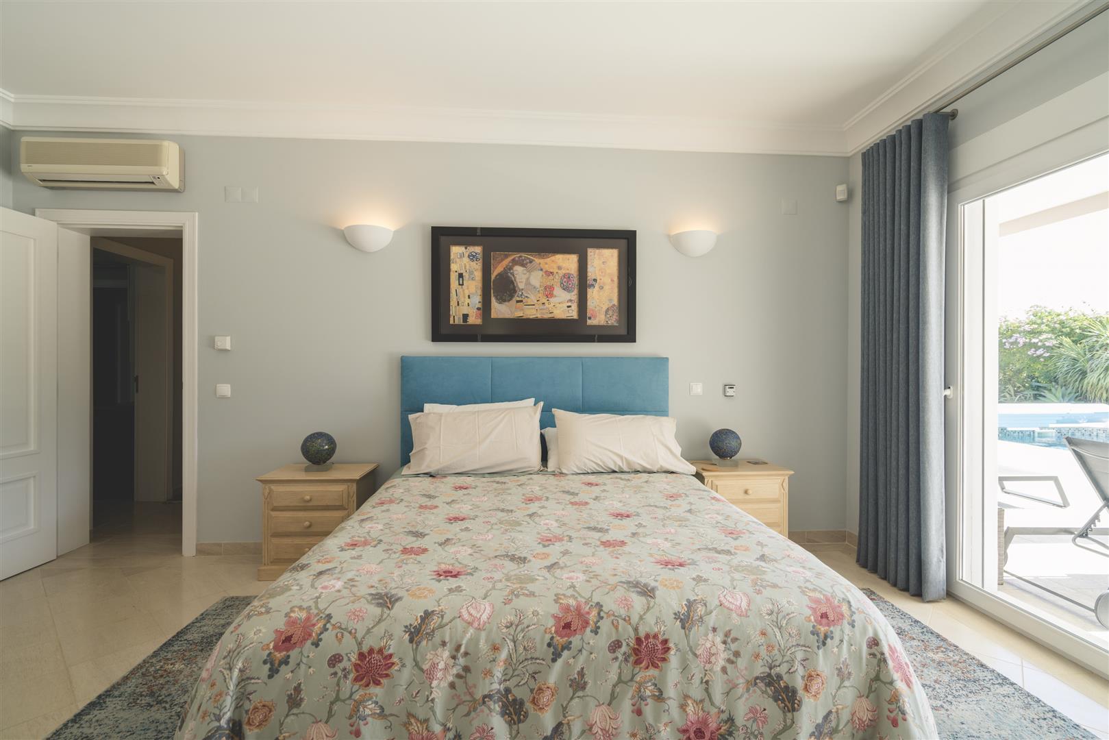 A staircase descends to the lower level, where you’ll find three further en-suite bedrooms and a versatile utility space that doubles as a gym and laundry area. Each bedroom features large glass sliding doors opening directly onto the pool terrace and mature garden. The master bedroom also benefits from a large dressing room.